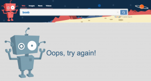 Çocuğunuz kendisi için uygun olmayan anahtar kelimelerle arama yaptığında Kiddle kendisine herhangi bir sonuç çıkarmayıp bir önceki sayfaya geri dönmesini öneriyor. Hatta ısrarla aynı kelimelerle arama yaptığında ise bu sefer arama çubuğunun yanındaki uzaylı robot, nükteli bir üslupla çocuğunuza bunu yapmaması gerektiğini hatırlatıyor.